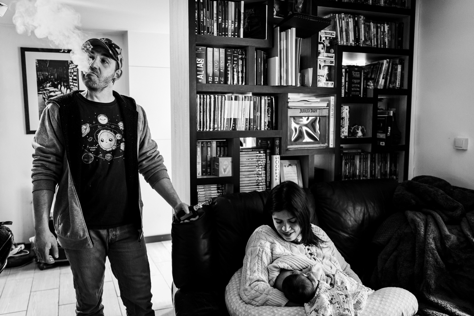 On change un peu des photos de Mariage ?? Comme il y avait un cadre d'un film de Charlie Chaplin (que j'adore !!) chez Johanne & Romain, à l'occasion de la séance Naissance de leur premier enfant, le titre de ce post en l'honneur de ce dernier me semblait tout à fait approprié !En effet, après une séance Grossesse délirante en extérieur cet hiver (publiée ici depuis), voici alors la suite réalisée avec eux au printemps, à domicile cette fois comme pour toutes mes prestations Naissance. Johanne & Romain m'avaient prévenu, chez eux c'était forcément un peu le bordel avec l'arrivée de bébé (où même sans ça me disaient-ils, ahah), légèrement exigu et pas très lumineux. Ok, et alors !? En 7 ans d'activité, je commence à présent à avoir fait un paquet de prestations directement chez mes clients, alors j'ai vu de tout, de la villa de 20 pièces jusqu'au studio de 12m2. Mais en soi, l'idée d'une telle séance lorsqu'elle se passe dans votre cocon, c'est précisément qu'elle vous ressemble, que vous vous y sentiez bien et que je m'imprègne au mieux de votre univers pour que les images captées vous correspondent à 200% ! Alors finalement, peu importe les conditions à la prise de vue, je m'en accommode et j'exploite tout de même le décor comme il se doit. Ici vous le constaterez, en résulte alors un shooting improbable, rock'n'roll et touchant à la fois, tout ce que je kiffe et que je suis fier de partager dans le coin. Merci encore Johanne & Romain pour votre confiance, votre spontanéité, vos délires... puis pour l'autorisation de publication qui dans ces cas là s'avère essentielle pour montrer précisément ce que j'adore faire dans ce taf et à quel point mes clients sont géniaux !! Vous aussi désirez à votre tour des photos qui sortent de l'ordinaire ? Go ! Attention, je rappelle tout de même que ces séances spécifiques maternité doivent se réserver encore plus longtemps à l'avance de mon côté (actuellement, je remplis le planning de novembre-décembre-janvier pour ça)... Contactez-moi dès le début de la grossesse par exemple pour être bien sûr d'avoir un créneau le moment venu !