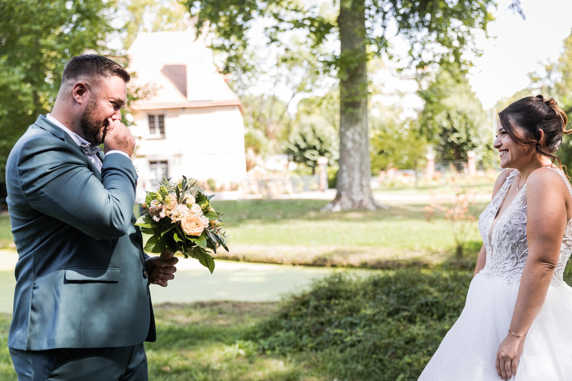 Pour la petite histoire, depuis que je fais ce métier il est arrivé à de très rares occasions que mes Mariés décident de modifier la date prévue de leur Mariage, pour des raisons personnelles. Bien sûr, je ne parle pas là de la période Covid où les reports étaient légitimes, mais bien de changement volontaire, généralement pour reculer cela à plus tard. Il y a aussi eu quelques fois où des couples signés ont tout annulé par la suite pour des motifs plus délicats (séparation en somme)... Concernant Laure & Jonathan, ce sont néanmoins mes premiers Mariés à avoir décalé la date...pour l'avancer de quasiment 1 an !! En effet, durant l'été 2021, ils m'avaient engagé pour leur Mariage le 1er juillet 2023 (selon les recommandations élogieuses d'un autre couple dont j'avais couvert le grand jour peu avant). Suite à notre premier visio qui les avait carrément motivé, ils s'étaient plongés à fond dans leurs préparatifs, à tel point qu'en fin de compte, rapidement 2023 leur semblait bien trop loin pour s'unir enfin... Ils me recontactaient alors l'automne dernier pour me demander ce qu'il me restait comme samedis de libres cet été... Autrement dit, je leur répondais qu'étant déjà bien blindé sur 2022, cela allait être compliqué ! Toutefois, leur enthousiasme et le feeling avec ces 2 là m'imposaient de leur trouver une solution. Je leur proposais alors exceptionnellement le samedi 27 août, où de base j'avais normalement prévu de ne pas faire de Mariage, compte tenu que j'en avais déjà un juste avant le mercredi 24 loin de chez moi (celui de Chloé et Quentin que je vous présentais récemment). Et voilà comment ils sautaient sur cette date en me la bloquant illico, et trouvaient du coup un autre lieu de réception libre lui aussi le 27 août afin que l'on puisse toujours collaborer ensemble ! Quant au 1er juillet 2023 qui s'était libéré dans mon agenda, il était de nouveau réservé peu après par d'autres futurs Mariés, pour leur plus grand bonheur également. C'est un fait, j'ai de plus en plus de couples qui calent ainsi leur date officielle de Mariage en fonction de mes disponibilités, ça me semble fou mais ça fait tout de même très plaisir. Surtout pour vivre de la sorte une prestation avec son lot de fun et d'émotion fortes !! Comme ici lors du magnifique first look de Laure & Jonathan dans le Jardin d'horticulture de Chartres, là même où nous avions réalisé leur séance Engagement cet hiver. C'est vrai que ça aurait été bien dommage de devoir attendre un an supplémentaire pour concrétiser tout cela...