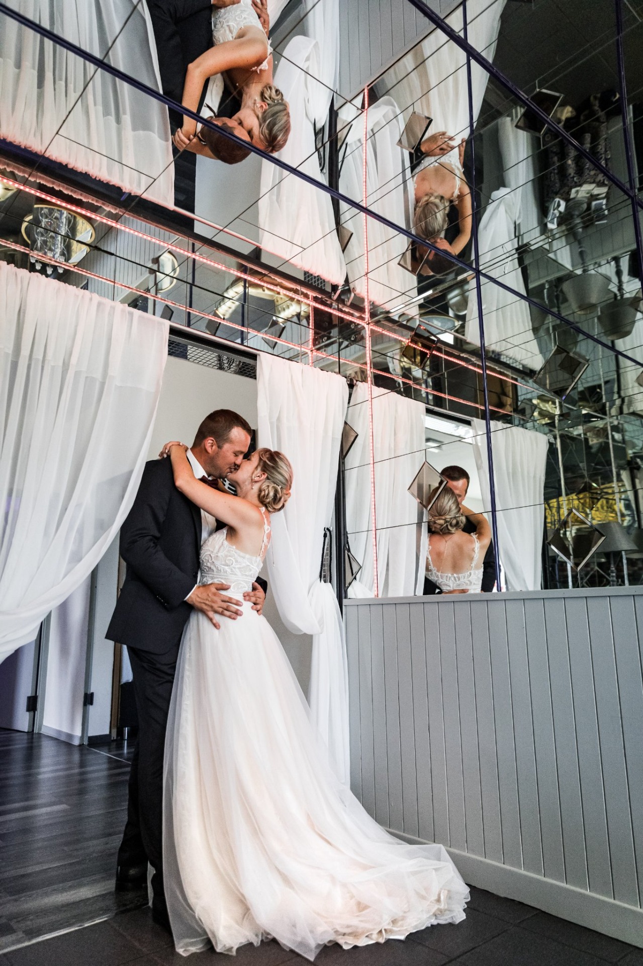 Quand Mélina et Arnaud m'ont réservé cette date 2 ans auparavant, ils m'indiquaient avoir choisi comme lieu de réception...une ancienne boite de nuit ! Ce complexe situé à Courville-sur-Eure et aujourd'hui baptisé Corvilla, que peut-être certain(e)s d'entre vous ont connu il y a quelques années sous le nom Loft Club ou encore L'Hacienda, attisait donc ma curiosité depuis...En découvrant l'endroit ce mois-ci, j'étais comme un gosse dans une kermesse pleine de stands car même totalement relooké, l'ambiance discothèque y est toujours présente et on devine encore le passé de ce lieu festif : les différents dancefloor, les bars, le set DJ, l'espace VIP, etc... Incroyable !! Principalement habitué aux domaines, manoirs et autres châteaux sur mes Mariages, ici le dépaysement était total et stimulait donc ma créativité différemment. Ainsi, si durant le cocktail j'emmène généralement les époux à l'écart pour réaliser quelques clichés de couple en extérieur, cette fois je dérogeais volontiers à cette règle (d'autant que nous avions déjà fait une séance plus tôt l'après-midi dans un joli parc fleuri lors de leur découverte !)... Bref, je me devais d'exploiter ce cadre insolite et classieux -en jouant également à nouveau avec les miroirs- pour livrer à mes chers Mariés des images tout autant originales qui leur rappelleront plus tard ce lieu choisi pour leur grand jour ! En voici un aperçu capté au gré de quelques salles sur place, même s'il y aurait pu en avoir d'autres...mais un petit incident "technique" est survenu au milieu de ce shooting improvisé... Je reviendrai dessus plus tard pour cette anecdote !