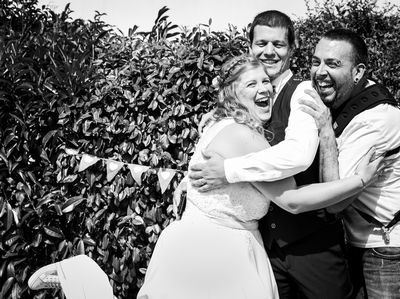 En fin d'après-midi ce jour-là, sous le soleil dans leur jardin, Anne et Pierre avaient même souhaité réaliser quelques photos avec moi (il est rare que l'on me demande cela). J'avais alors retiré temporairement mes boîtiers de leurs harnais pour les confier à un remplaçant de choix (chose encore plus rare, que je n'avais même jamais faite). Et voilà comment pour une fois le Photographe se retrouvait à délirer avec les Mariés...sur ses propres images !
